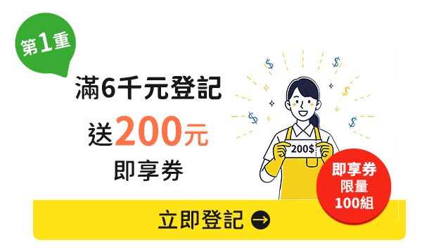 6. 贈品不可累贈,僅擇最高門檻贈送。例如:累計消費達 NT$12,000,則依門檻獲得 200 元即享券與抽獎資格,不再重複贈送 6,000 元門檻之 200 元即享券。