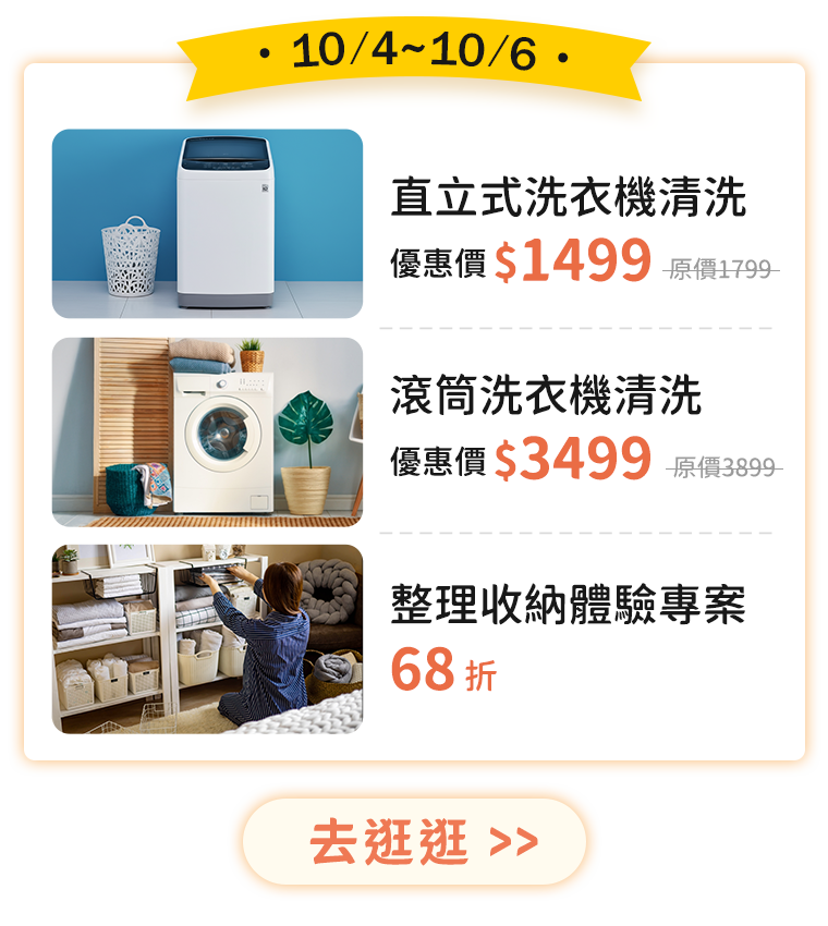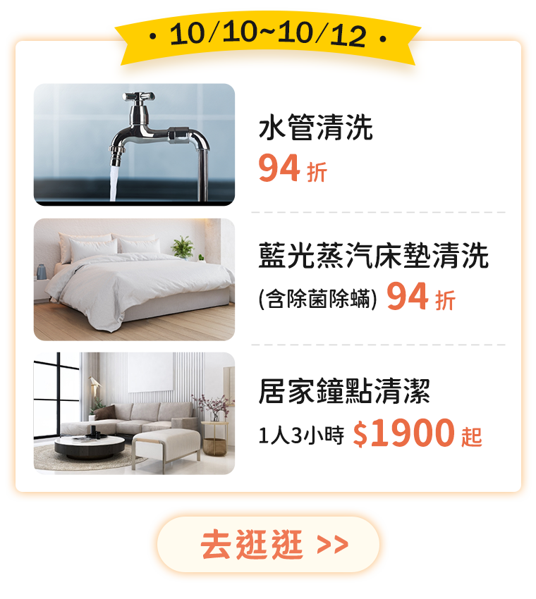 活動內容:於活動期間內加入HoHo會員,下單全站任一家用服務(商用服務不適用)單筆滿1500元,並於活動頁登記(限量100組,依登記順序為主),即可於服務完成後,憑EDM前往10/10指定分店領取「BONDI WASH 檸檬茶樹及柑橘地板清潔液 125ml」乙瓶(每名會員帳號限領取乙次)。