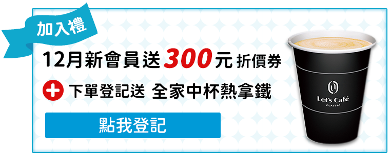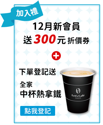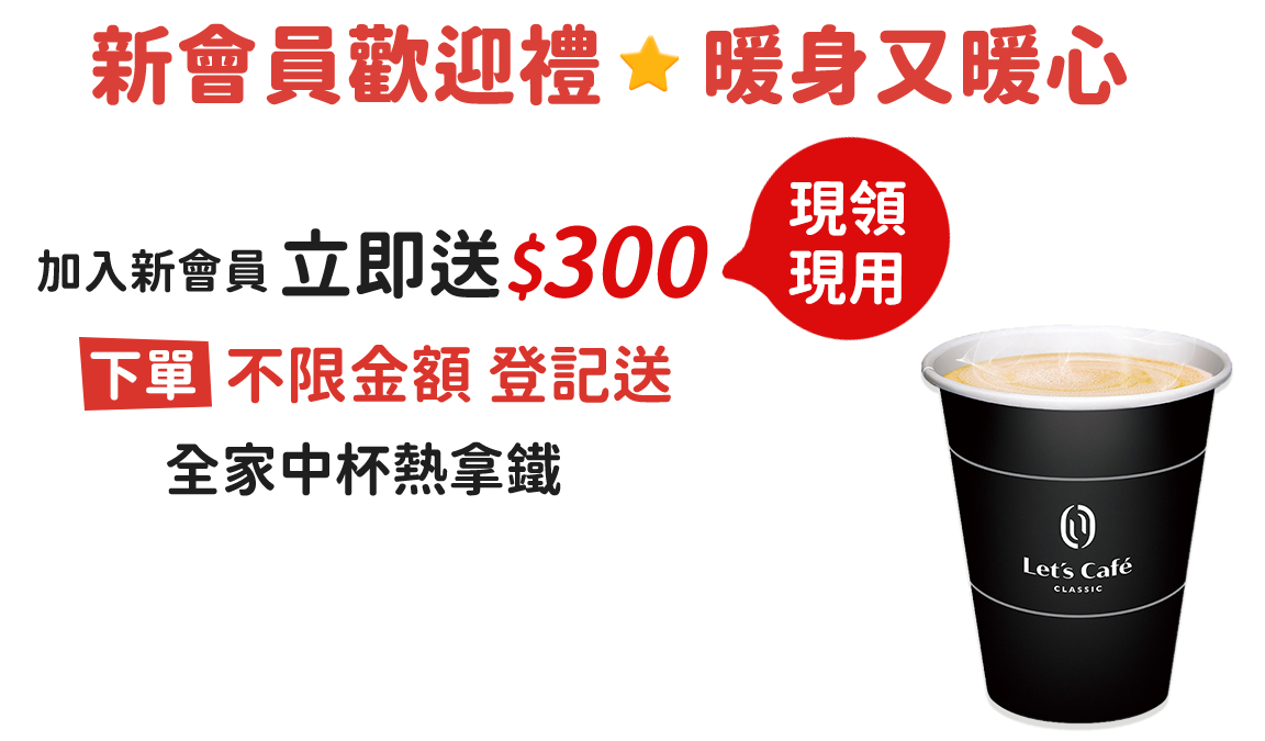 • 活動內容:於活動期間內加入HoHo會員,並下單全站任一家用服務或商品,登記完成後加贈全家中杯熱拿鐵即享券乙張。