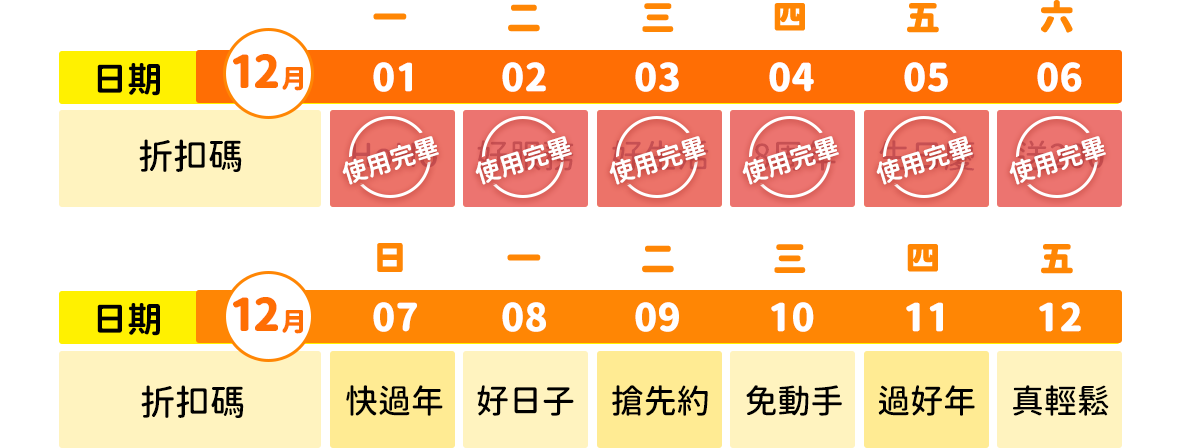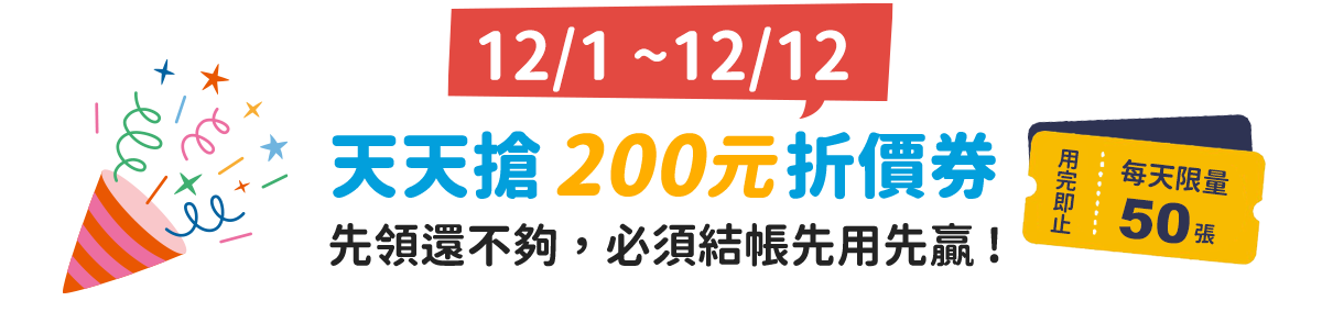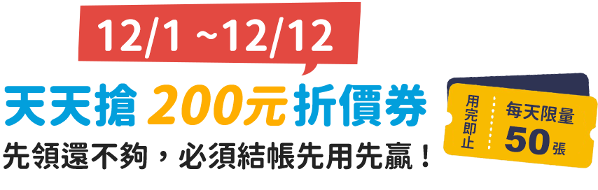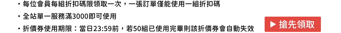 1. 每組折扣碼僅限於當日23:59前有效,每日折扣碼限量50組,以實際結帳順序為依據,先用先贏,用完為止。若當日50組已使用完畢,折價券將會自動失效。