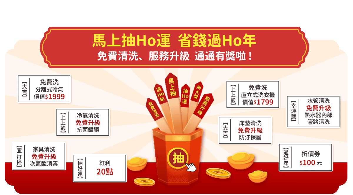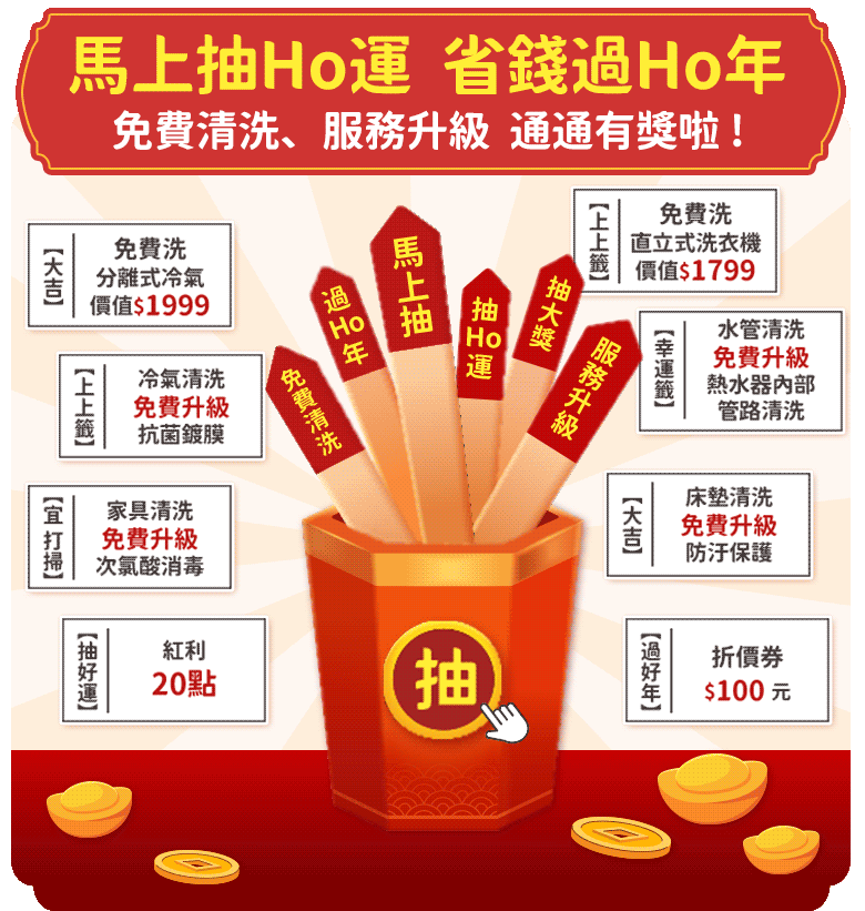 二、「冷氣清洗免費升級抗菌鍍膜」、「床墊清洗免費升級防汙保護」、「家具清洗免費升級次氯酸消毒」、「水管清洗免費升級熱水器內部管路清洗」